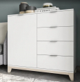 Распашная дверь, за дверью - полка. Четыре выдвижных ящика на шариковых направляющих. Ручки - торцевые, металл, 96 мм. Цоколь комода - деревянное основание, высотой 100 мм.