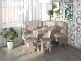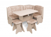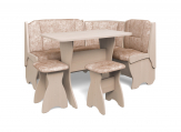 Набор мебели для кухни, включающий в себя угловую скамью, стол и два табурета. В угловой скамье под сиденьями расположены два ящика. Каркас ЛДСП. Покрытие верхней части столешницы стола - термостойкий пластик, кромка ПВХ - 1мм. Углы столешницы закруглены для избегания травмирования и придания лучшего эстетического вида.